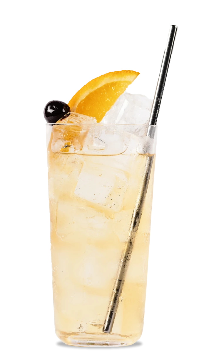 The Natterjack Highball is a crisp and vibrant cocktail featuring Natterjack Blend 1 whiskey, soda water, and a refreshing orange garnish, complemented by a cherry mascherano for a touch of sweetness and color.